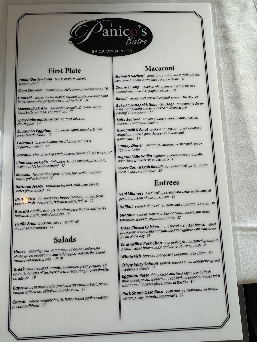 The menu at Panico's Bistro is a delightful showcase of Italian flavors, featuring must-try items such as their renowned wood-fire pizzas and delectable pasta dishes. The Vongole pizza and halibut with sherry cream sauce have garnered rave reviews, while the fried eggplant and pork chop with gnocchi tantalize taste buds with perfection. Don't miss out on the complimentary focaccia and rich desserts that will leave you craving more.